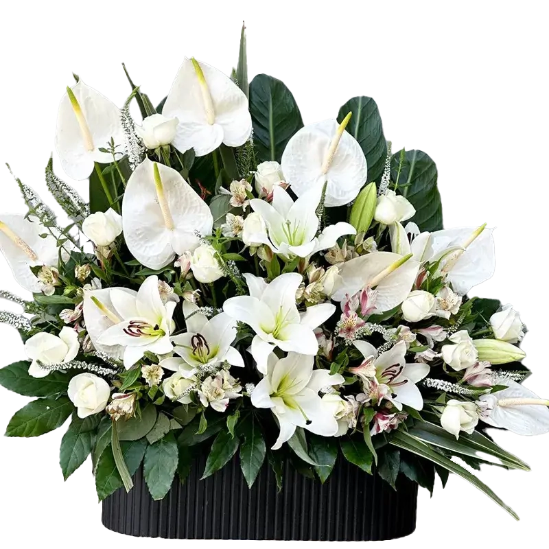 آنتوریوم با برگ‌های براق و مفهوم همدردی، حس آرامش و همراهی را در سبد گل تسلیت تقویت می‌کند.